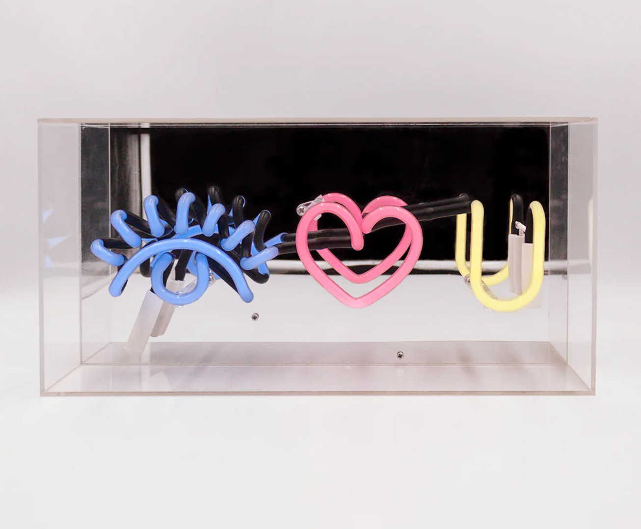 - Disponible en tube néon en verre rose, bleu et jaune.