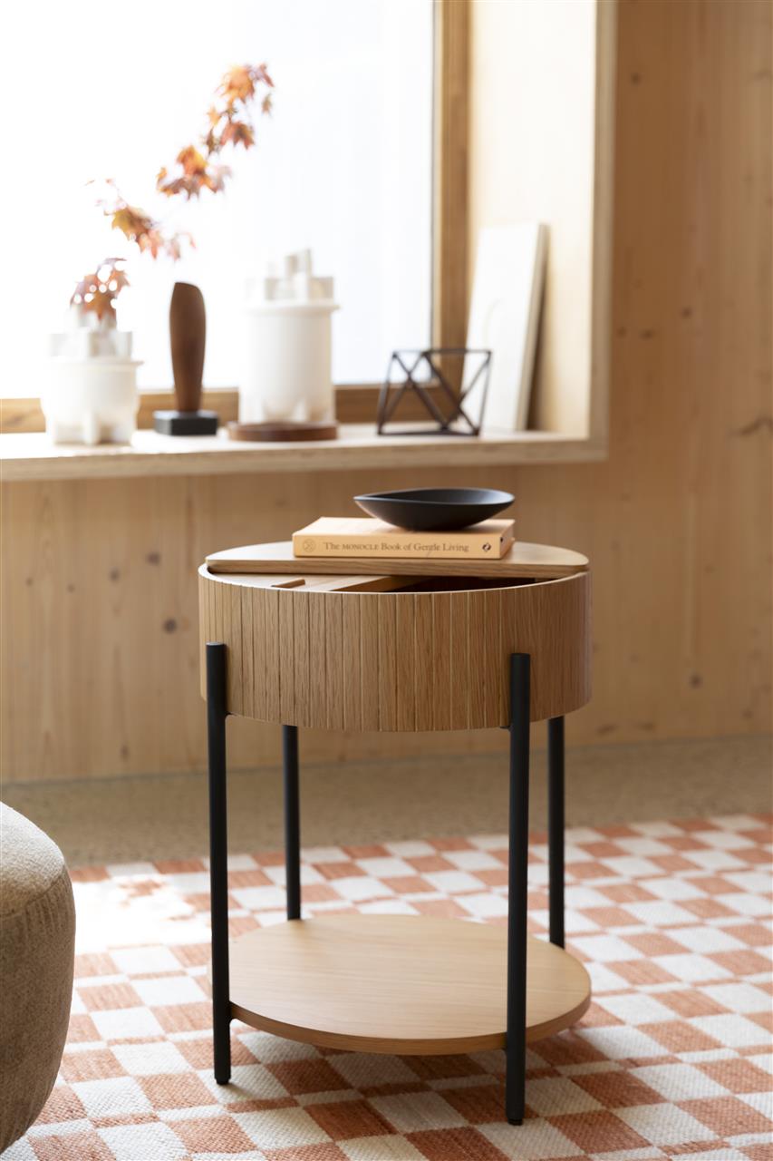 Sublimez votre espace de vie avec les élégantes et polyvalentes tables Slides. La table d’appoint Slides se distingue par son ingénieux plateau coulissant. En le faisant glisser, un compartiment de rangement dissimulé se révèle. Confectionnées avec une attention exquise aux détails, ces tables allient avec raffinement un placage de chêne et des pieds en métal noir thermolaqué, offrant ainsi une parfaite harmonie entre beauté naturelle et design contemporain.